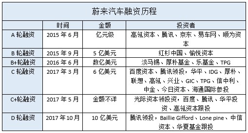 与长城和宝马等传统车企向纯电动车伸出橄榄枝不同,蔚来汽车是一个此前没有汽车生产历史,现在由江淮汽车代工的造车新秀,其发展完全靠风险投资来扶持。蔚来汽车至今已募集超过150亿元资金,主要股东包括创始人李斌持股17.2%、腾讯持股15.2%、高瓴资本持股7.5%。