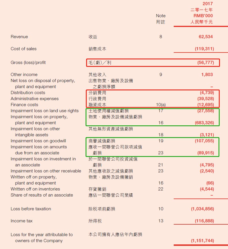 仔細分析2017年的巨額虧損,如下圖紅色框所示(摘自2017年年報),在銷售成本、分銷費用、行政費用和融資成本等合計只是虧損約1.14億元人民幣;有約9.23億元的虧損,則是來自減值虧損及撇帳虧損,如下圖綠色框所示。主要是對葯業板塊所屬資產作出評估及減值,包括廠房設備減值虧損6.83億元人民幣、商譽減值虧損1.07億元人民幣、應收款減值虧損8992萬元人民幣。