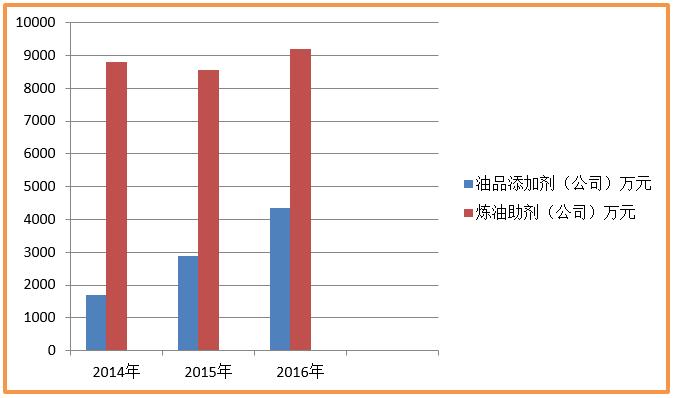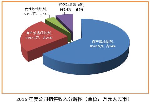 我们如果以最近一个完整财政年度的2016年为例来看看公司生产销售规模的话,如下图所示,公司自产的炼油助剂销售收入为8670.5万元,占当年销售收入的64%;公司自产油品添加剂3397万元,占当年销售收入的25%;公司代理的海外进口炼油助剂收入为534万元,占当年销售收入的4%;公司代理的海外进口油品添加剂收入为962万元,占当年销售收入的7%。