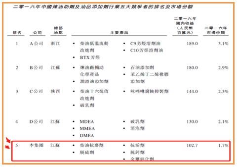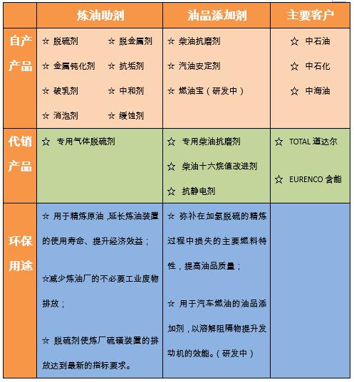 公司致力于推动创新、环保、可持续的炼油技术的发展。按2016年的国内销售收入计算,公司为中国前五大炼油助剂和油品添加剂生产商。