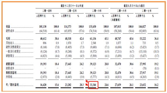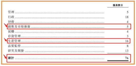 其实,拿到公司的上市资料,最令投资者惊艳的地方,是其高效的生产方式和高额的人均创利水平。截至最后实际可行日期,公司共有76 名员工,如下图所示。其中生产管理人员为16人,而公司上市前最近的一个完整财政年度,2016年公司自产销售收入为1.2亿元(货币单位:人民币,下同),生产人员人均年生产值为750万元;