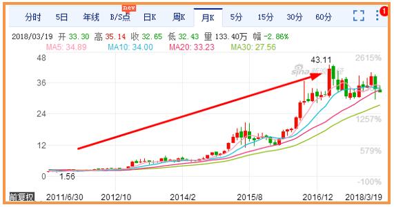 江苏创新在港股市场可以对标的上市公司可能并不多。但是在A股市场的三聚环保(300072),可以对比着说一说。如下面的股价月线图可以看到,三聚环保股价在前复权后,历时近7年,股价从最低价1.56元一路奔袭到最高价43.11元,上市后最大涨幅为近27倍。