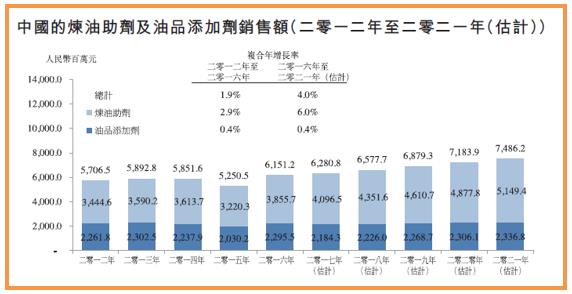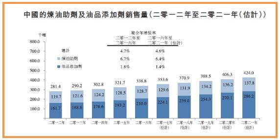 (2)中国柴油抗磨剂细分市场。据灼识咨询调研所得,随着燃油质量和排放标准的不断提高,汽油中允许的硫含量相应下降,炼油厂所生产燃油的抗磨作用亦会降低。预期于未来数年燃油添加剂(如柴油抗磨剂)的使用量增加,预期2016年至2021年中国柴油抗磨剂的销售量按复合年增长率4.2%上升,较其他油品添加剂的复合年增长率为高;销售金额亦将由2016年的5.01亿元,以复合年增长率3.8%持续上升至2021年的6.04亿元。