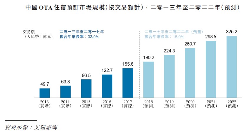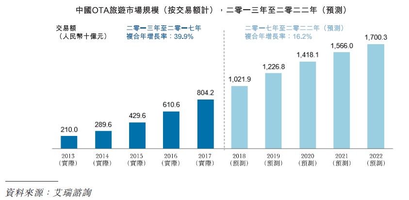 中国大部分的在线旅游预订均是通过OTA(online travel agency)完成的。OTA为用户和旅游服务供应商提供独特富价值的选项。用户可以享受高效和全面的预订服务,而旅游服务供应商可以受益于OTA提供的技术和数据驱动解决方案。中国的OTA市场在2017年达到人民币8042 亿元,预计到2022年将增长至人民币17003亿元,复合年增长率为16.2%。根据艾瑞咨询的资料,于2017年,中国的OTA市场占在线旅游市场总量的68.6%,并将继续在未来多年为中国在线旅游行业的领先渠道。