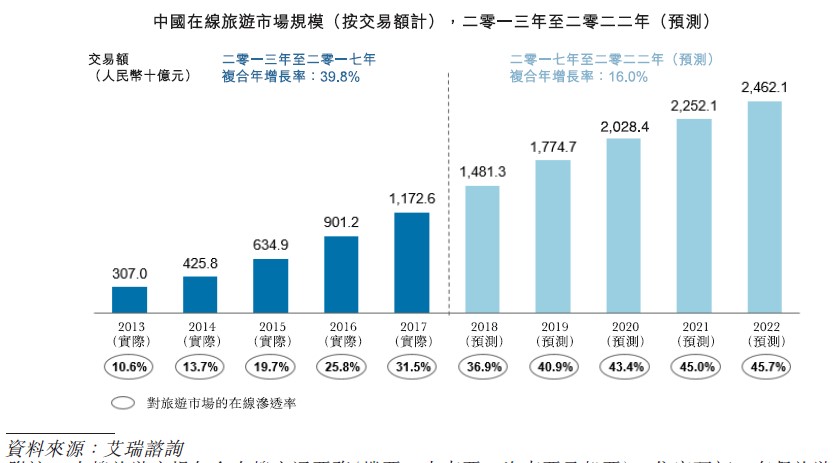 中国拥有庞大且飞速增长的在线旅游市场。以总交易额计,中国在线旅游市场规模从2013年人民币3070亿元增至2017年人民币11726亿元,复合年增长率为39.8%,预期于2022年进一步增至人民币24621亿元,复合年增长率为16.0%。中国旅游市场的线上渗透率由2013年的10.6%升至2017的31.5%,预计到2022年将进一步升至45.7%。然而,中国在线旅游市场规模在旅游市场的占比,相比发达国家仍然偏低,例如美国在2017年达到45.0%。