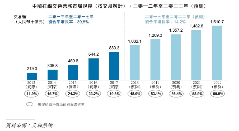在线机票是中国在线交通票务板块下最大的细分板块。在线航空票务于2015年、2016年及2017年的交易额中分别占在线交通票务板块的60.5%、58.7%及57.9%。此外,在线航空票务交易额由2013年人民币1447亿元增加至2017年人民币4809亿元,复合年增长率为35.0%,预计到2022年交易额将进一步增至人民币8630亿元,复合年增长率为12.4%。于2015年、2016年及2017年,在线航空航段量分别达到2.662亿、3.89亿及4.93亿。