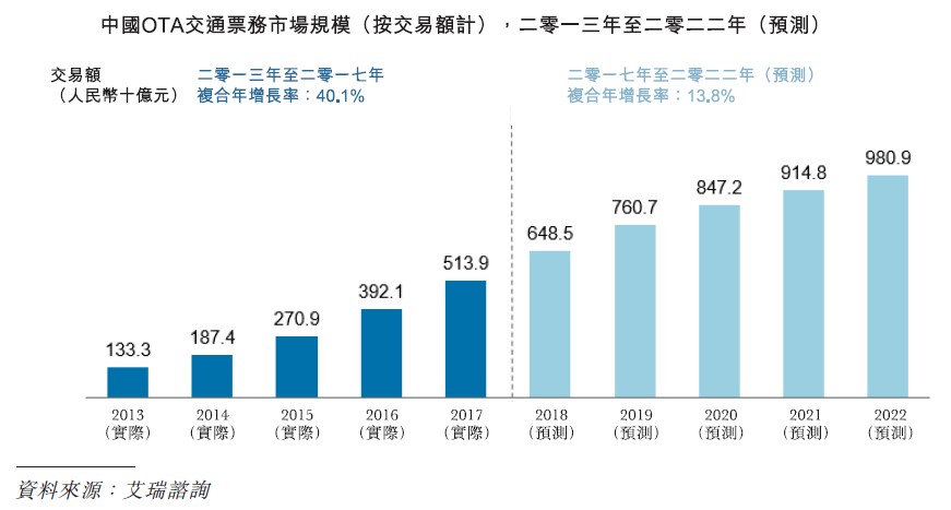OTA于中国在线交通票务板块担当重要角色。以交易额计,其从2013年贡献人民币1333亿元(于在线交通票务板块占比60.8%)增至2017年人民币5139亿元(于在线交通票务板块占比为61.9%)。按2017年交易额计, 中国四大OTA分别占中国OTA交通票务市场的59.6%、18.2%、15.6%及2.1%市场份额,而按同程艺龙(00780.HK)合并基准计,其以15.6%的市场份额位列第三。