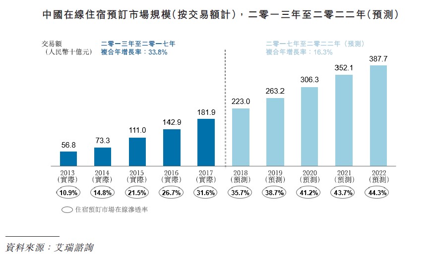 中国的在线住宿预订分部交易额从2013年的人民币568亿元增加到2017年的人民币1819亿元,复合年增长率为33.8%,预计到2022年交易额将进一步增加到人民币3877亿元,复合年增长率为16.3%。就间夜而言,2015年、2016年及2017年在线住宿预订间夜分别达到4.074亿间、5.324亿间及6.58亿间。按2017年交易额计, 中国四大OTA分别占中国在线住宿预订市场的47.6%、18.1%、12.3%及6.1%市场份额,而按同程艺龙(00780.HK)合并基准计,其以12.3%的市场份额位列第三。