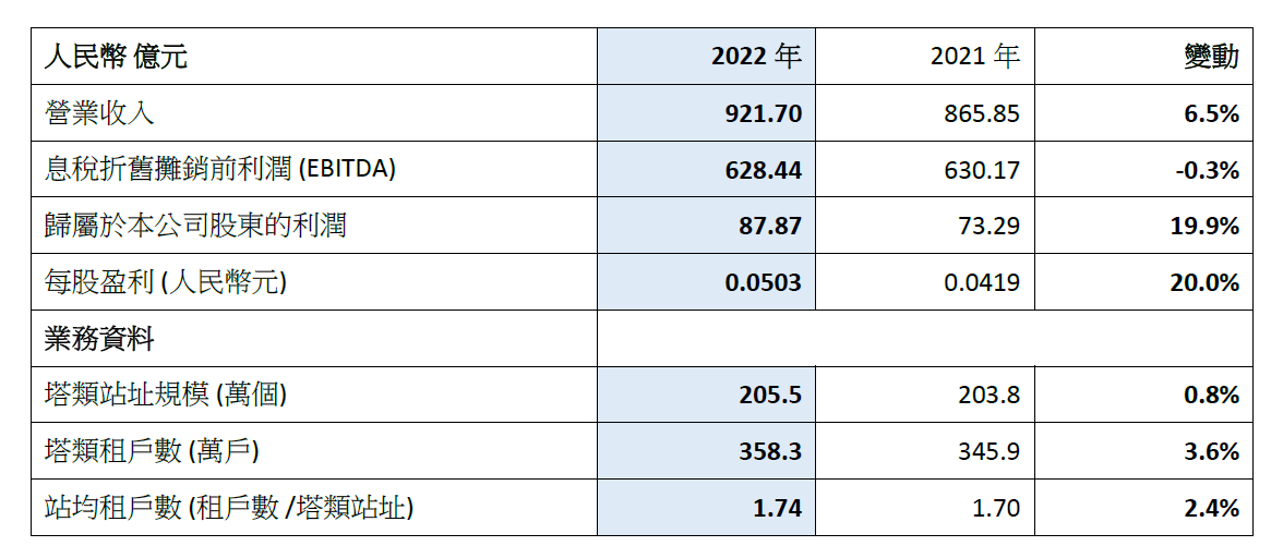 2022年,公司营业收入稳定增长,达到人民币921.70亿元,同比增长6.5%;EBITDA1达到人民币628.44亿元,EBITDA率2为68.2%;归属于本公司股东的利润为人民币87.87亿元,同比增长19.9%,净利润率为9.5%,盈利能力持续增强。
