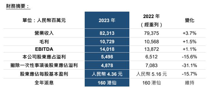 1. 北京燃氣合併口徑天然氣銷售量為 240 億立方米,同比上升 10.6%;營業收入達人民幣 614.7 億元,同比上升 2.7%;天津南港項目一期工程順利投產;