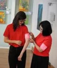 圖片二:行政長官夫人暨義工總領袖李林麗嬋女士(右)為義務工作發展局主席彭韻僖律師(左)整理義工臂章,寄意傳承行義力量,人人皆可做義工。